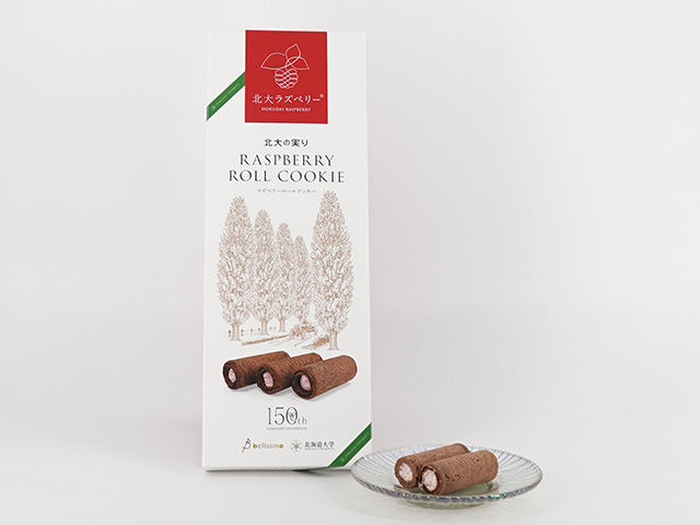 「北大の実り ラズベリーロールクッキー」は、ココア生地のクッキーでラズベリークリームを包みました。